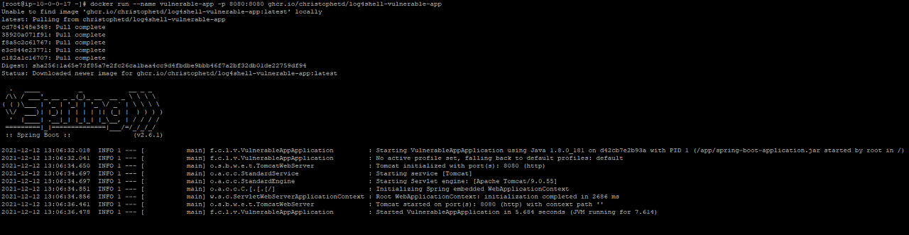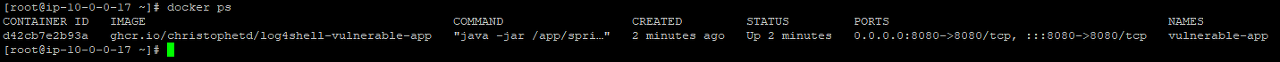 yum install docker dockerd docker run --name vulnerable-app -p 8080:8080 ghcr.io/christophetd/log4shell-vulnerable-app docker ps
