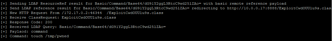 -> 아래와 같이 LDAP IP:1389~~ 커맨드가 HTTP로 리다이렉트 되었다가 악의적인 명령어(touch /tmp/pwned)를 응답한다.