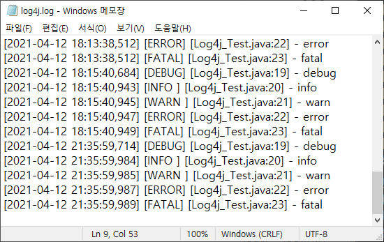 ->> 결과 - 파일 출력 : log4j는 log 파일로 출력이 가능하다. 아래 경로를 통해서 파일에 잘 출력된다.