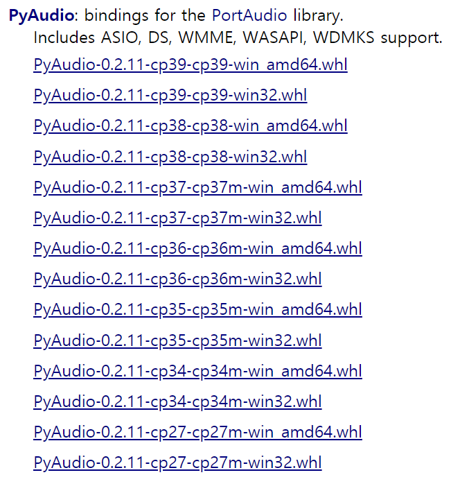 PyAudio에 해당하는 라이브러리 목록을 보면