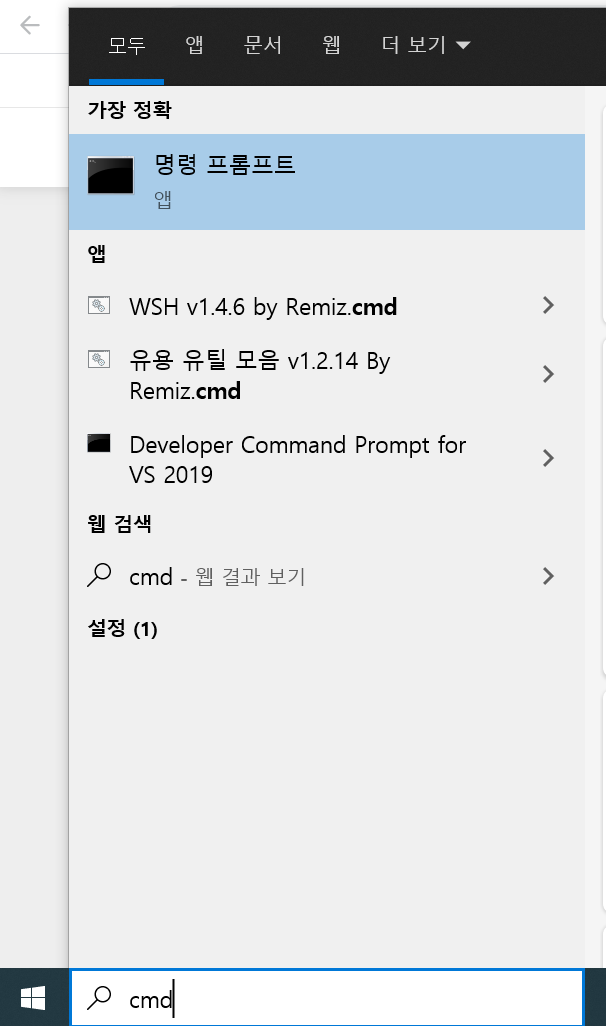 cmd창을 여는 방법은 윈도키 옆 검색창에 "cmd"를 입력하고 엔터를 치면 cmd창이 열립니다.
