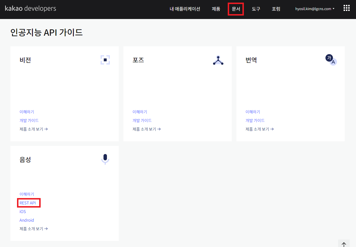 상단 메뉴에 [문서]버튼을 눌러 화면을 아래로 내려보면, "인공지능 API가이드"라는 부분이 있습니다.