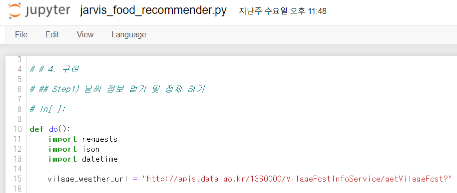 주피터 노트북에서 jarvis_food_recommender.py 파일을 열고, do() 함수로 정의합니다. 코드를 전체 선택해서 키보드에 있는 [Tab] 키로 일괄 들여 쓰기를 하고, 10라인에 def do(): 라고 기재하는 것이 제일 간단합니다.