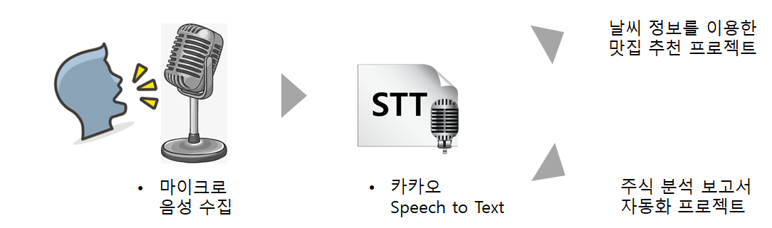음성을 통해 제어하기 위해 컴퓨터에 내장된 마이크(mic)로 음성을 수집합니다. 카카오의 Speech-To-Text(이하 STT) OpenAPI로 수집된 음성을 Text로 변환합니다. Text를 분석하여 "날씨"라는 글자가 있다면, "날씨 정보를 이용한 맛집 추천 프로젝트"가 수행되고, "주식"이라는 글자가 있다면, "주식 분석 보고서 자동화 프로젝트"가 수행됩니다.