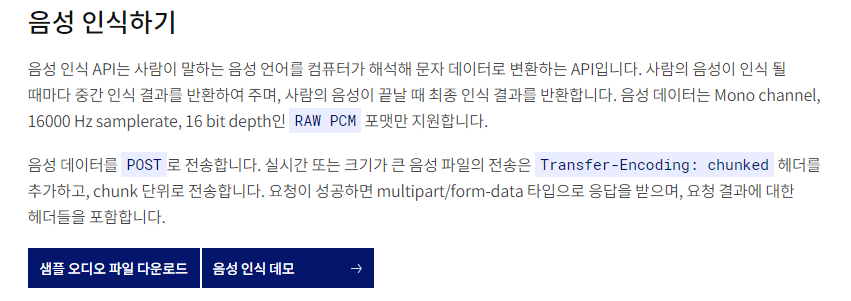 음성과 관련해서는 '음성 인식'과 '음성 합성'을 지원하고 있습니다. 음성인식이 STT에 해당합니다. 하여, 이번장에서는 음성인식만 다루도록 하겠습니다. 설명을 보면, 주의 사항이 보입니다. 음성 데이터는 "Mono channel, 16000Hz samplerate, 16bit deapth인 RAW PCM 포맷만 지원한다"고 되어 있습니다.