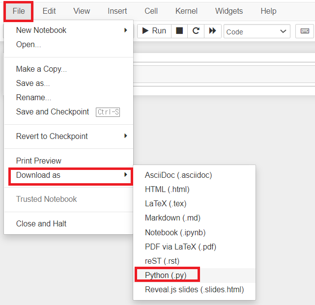 이후 주피터 노트북에서 File > Download as > Python(. py)를 눌러 jarvis_food_recommender.py 파일을 다운로드한 후, 현재 작업 중인 폴더 위치로 옮겨 줍니다.