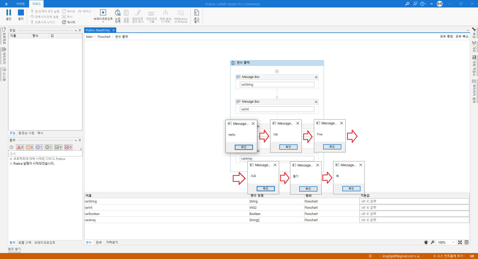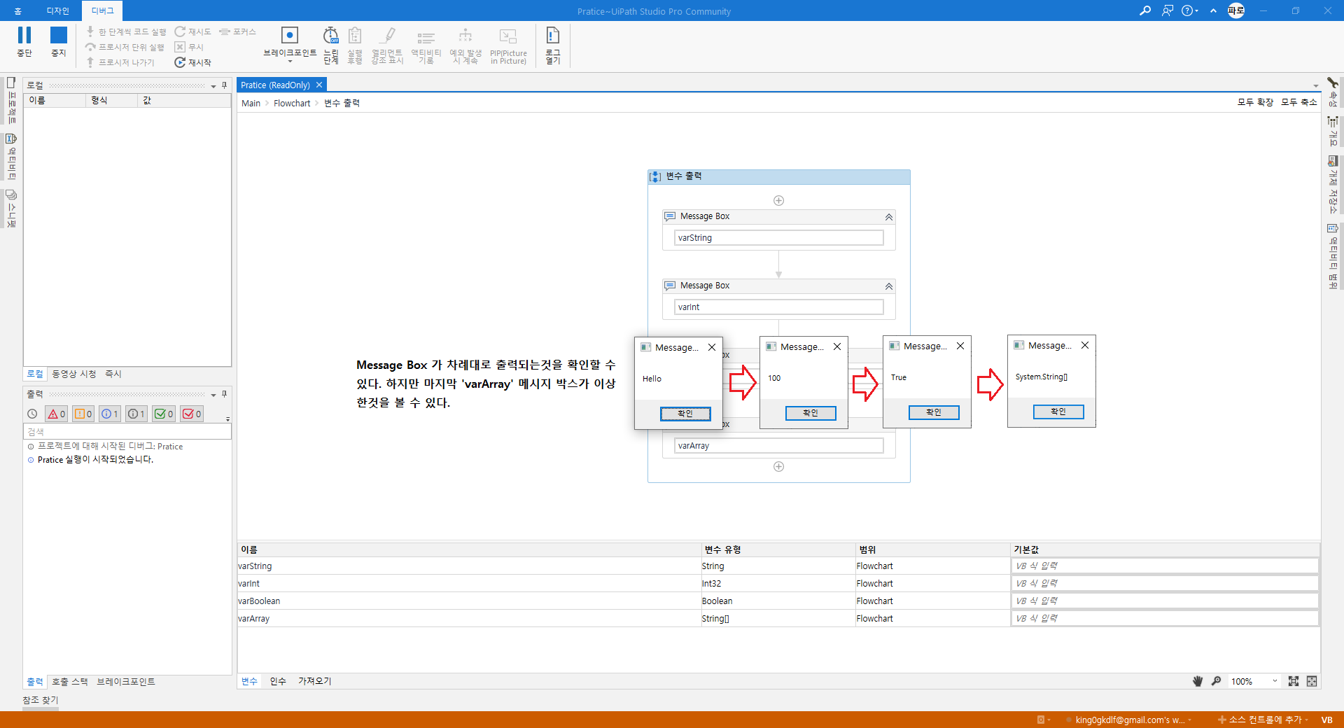 마지막 'varArray' 배열 메시지 박스가 이상하게 출력되는것을 볼 수 있다.