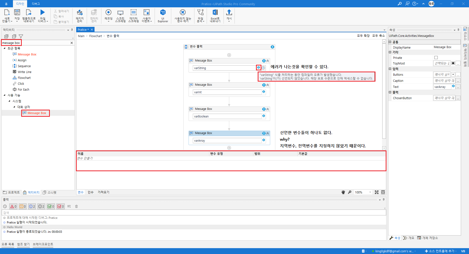 출력의 경우 'Message Box'를 이용하여 간단히 출력해보겠다. 하지만 '에러'가 나타나는것을 볼 수 있다.