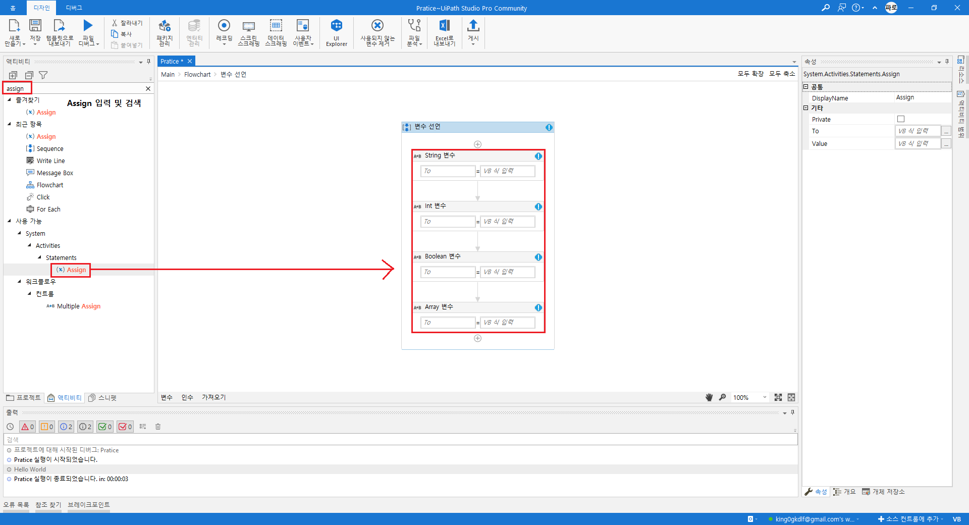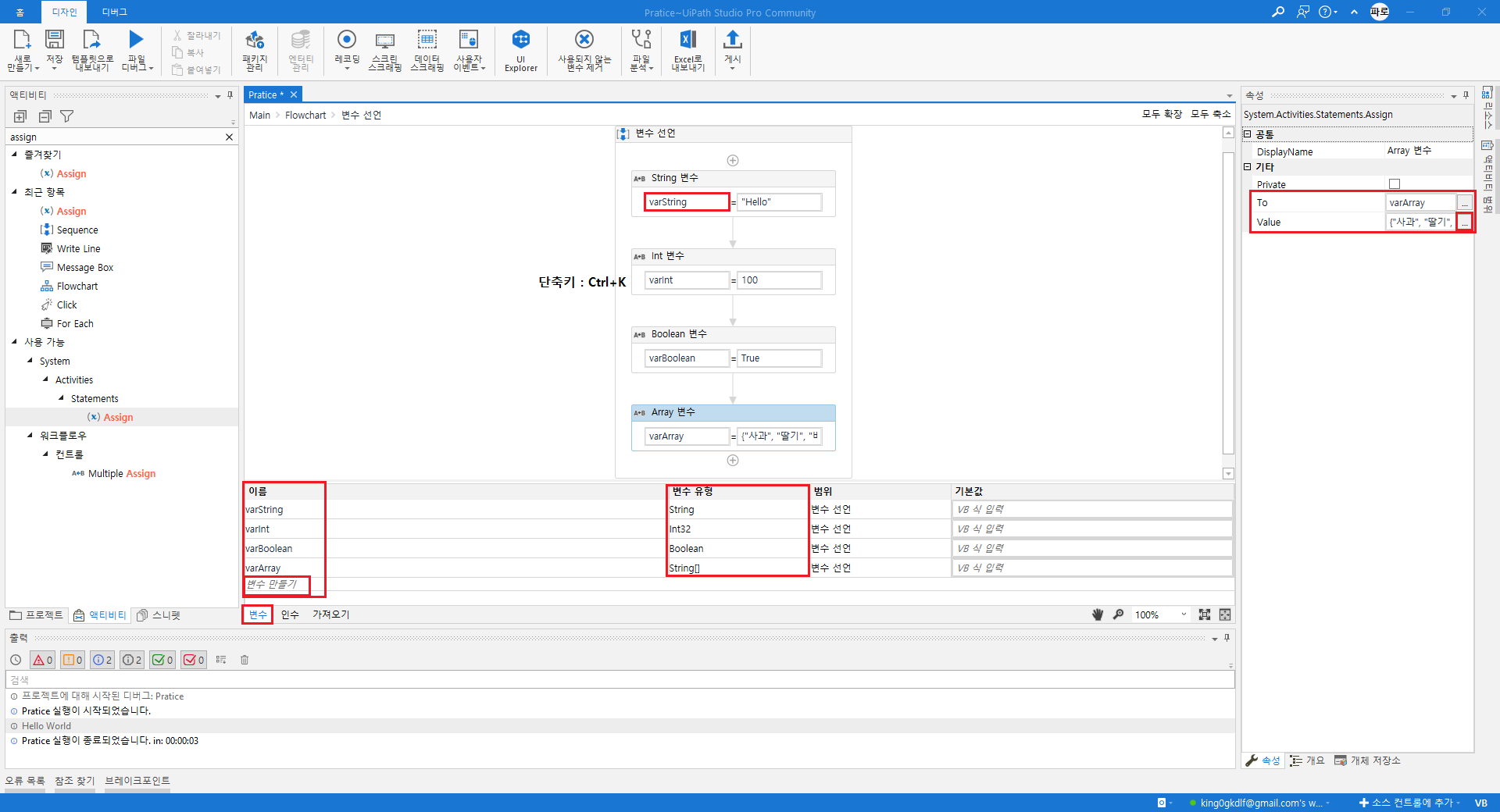 'Assign'에서 'Ctrl+K' 단축키를 이용하여 변수 선언,