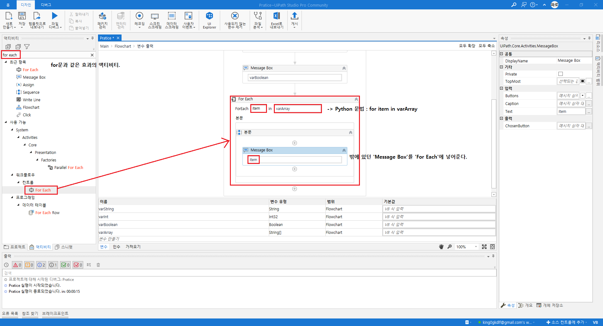 배열을 하나하나 출력하기 위해서는 반복문이 필수적이다. UiPath 액티비티에서의 for문인 'For Each' 액티비티를 사용한다.