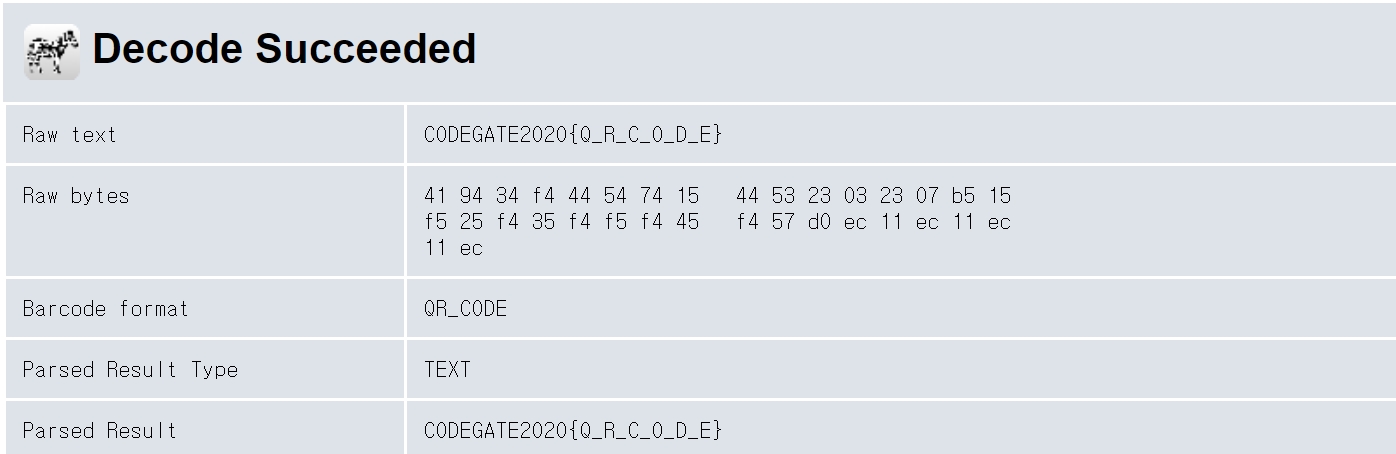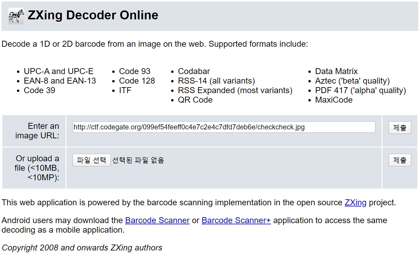 : 바코드의 숨겨진 플래그 값을 찾아내는게 핵심인 문제인 것 같다. 온라인 상에서 돌아다기는 ZXing Decoder를 이용해서 값을 찾을 수 있다