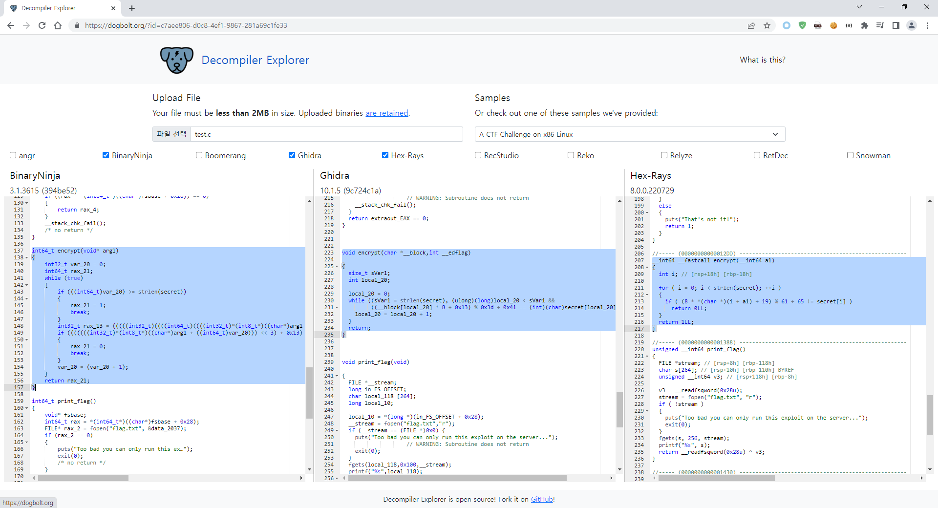 > https://dogbolt.org/ 사이트 이미지 - 디컴파일러에 따라 구문을 비교하기 편한 사이트이다.