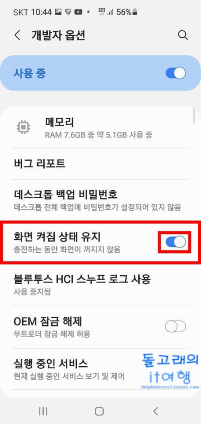 5. [화면 켜짐 상태 유지] 항목 활성화 버튼 켜기