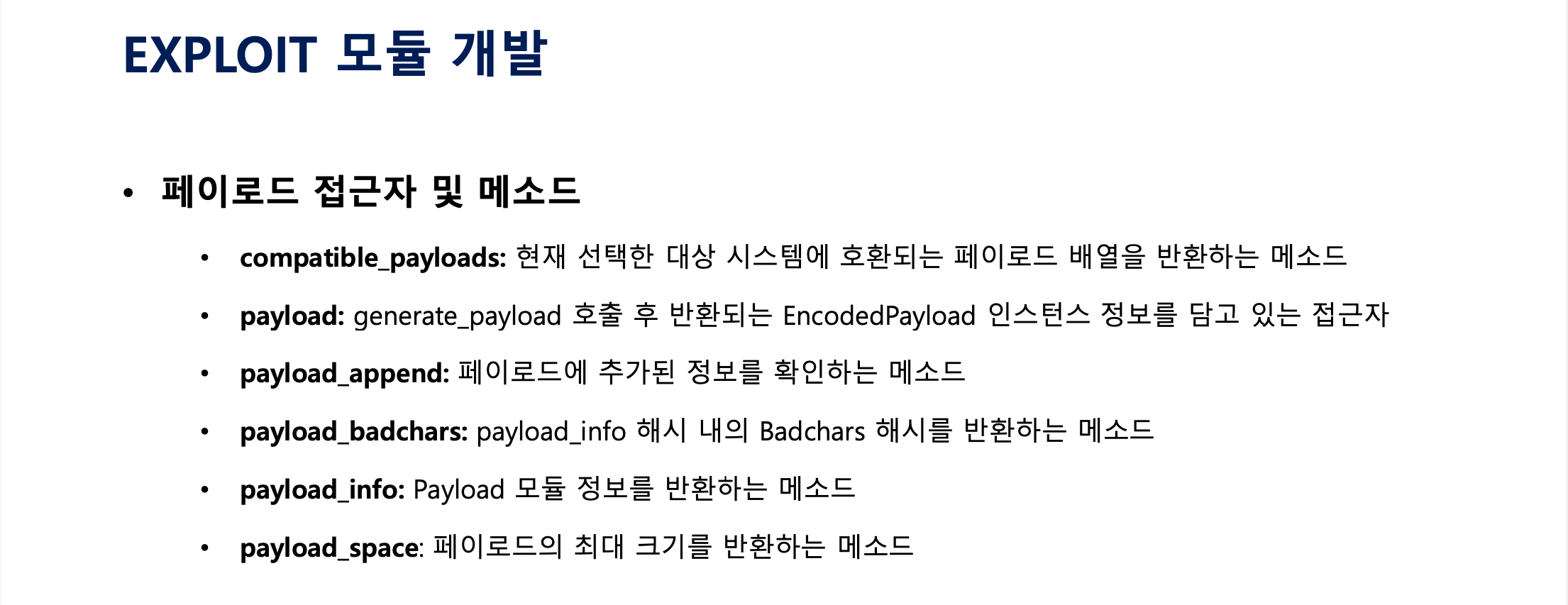 -> 페이로드 접근자 및 메소드도 위의 방식대로 작성해서 페이로드를 생성할 수 있다는 것이다. 페이로드를 생성하거나 혹은 페이로드에 대한 정보를 조회하거나, "payload_badchars" 접근자를 가지고 다른 메소드를 실행할 때 넘겨준다거나 등등이 있다
