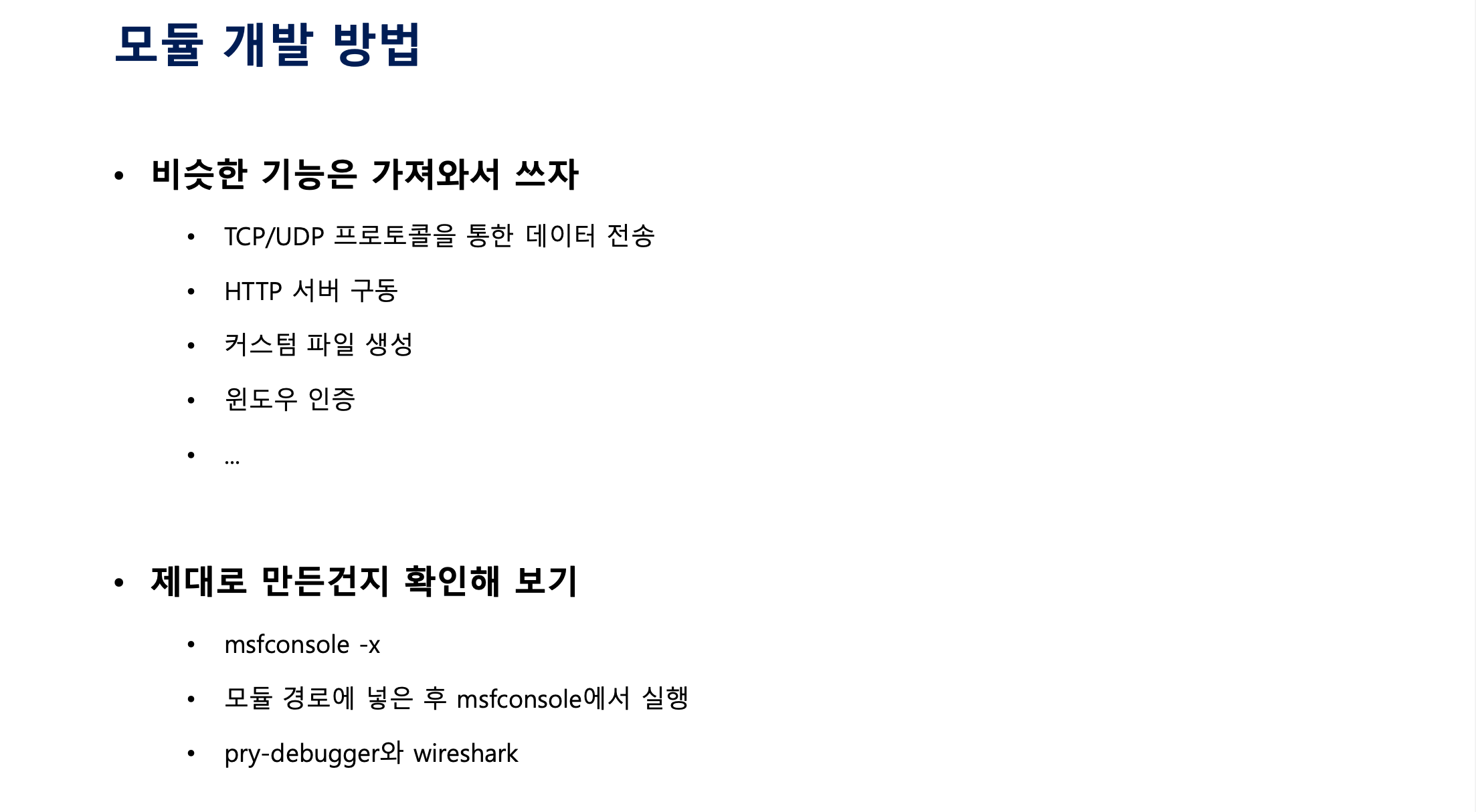 -> 추가적으로 본인이 개발한 모듈이 제대로 작성되었는지 확인하려면 msfconsole을 한 줄 실행해도 된다. 또는 리소스 파일을 이용해도 된다. 또는 Pry를 이용해서 본인이 원하는 데이터 구조를 잘 만들었는지 확인하면 된다. 원격 코드 같은 경우에는 wireshark 체크를 통해서 직접 패킷을 확인해보면 된다