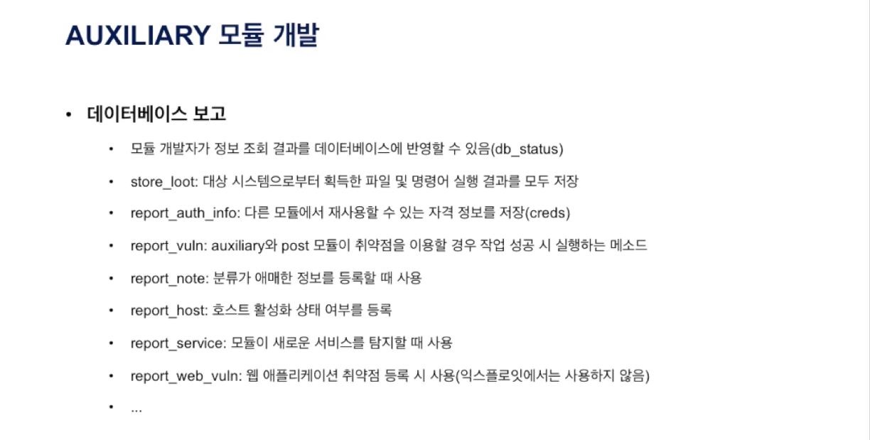 -> 초중급 과정에서 DB-Nmap 혹은 Port-Scan을 했던 결과 값이 자동으로 데이터베이스에 들어갔던것을 기억할 것이다. hosts, servers... 이런식으로 명령을 입력하면 현재 스캔한 결과가 메타스플로잇 DB에 자동으로 등록된 것을 볼 수 있다. 이게 모듈 사용 입장에서는 자동으로 등록된 것이지만, 모듈을 개발하는 입장에서는 이것을 직접 등록한다고 생각하면 된다. 예를 들어, 스캐너 모듈을 개발했을때 스캐너 모듈이 수행한 결과, 어떠한 대상 서비스를 식별했다거나, 서비스의 버전까지 식별했다 등을 코드 상에서 직접 등록을 해줘야 한다. ftp 버전을 확인했는데 1.0 이라고 한다면 정보를 "report_service"라는 메소드를 이용해서 IP, Port, 대상 서비스(ftp), 자세한 정보는 freeftpd 1.0이라는 것을 메소드로 직접 등록을 해줘야한다