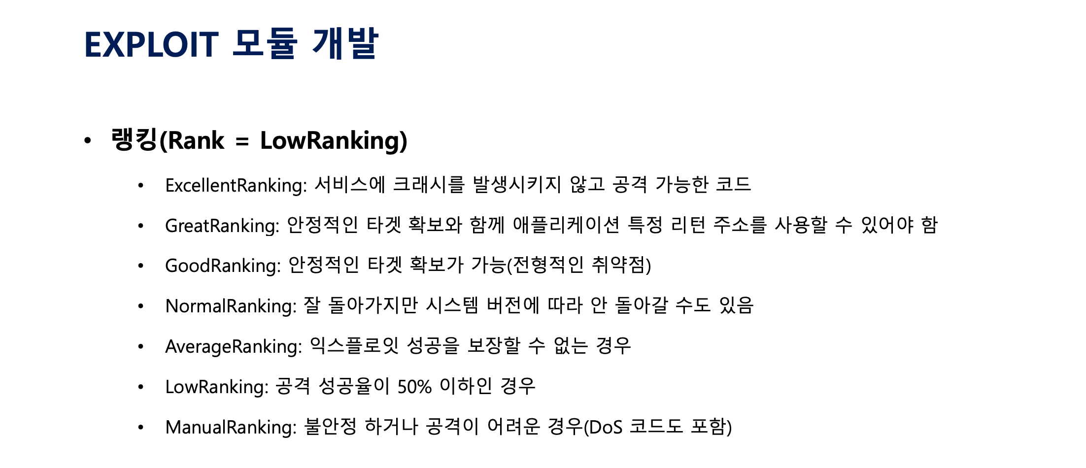 -> 익스플로잇 모듈 개발을 할 때 "랭킹"이라는 것을 적어줘야 한다. msfconsole에서 "Search"로 모듈 검색을 해보면 "Rank"라는게 나온다. 이 모듈이 어느 정도의 성공률을 보장하느냐를 나타내는 지표라고 생각하면 된다. 위의 랭킹으로 책정된다고 보면 된다
