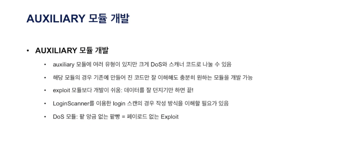-> 다음으로 Auxliary 모듈 개발도 마찬가지이다. 익스플로잇 모듈 개발하는 것과 똑같다. 모듈 개발 방법론에 따라 개발하면 된다. 크게 "DoS"와 "스캐너" 코드만 보아도 된다. "DoS"는 페이로드 없는 익스플로잇으로 익스플로잇 모듈 개발을 한다면 도스 모듈 개발은 일도 아니게 된다