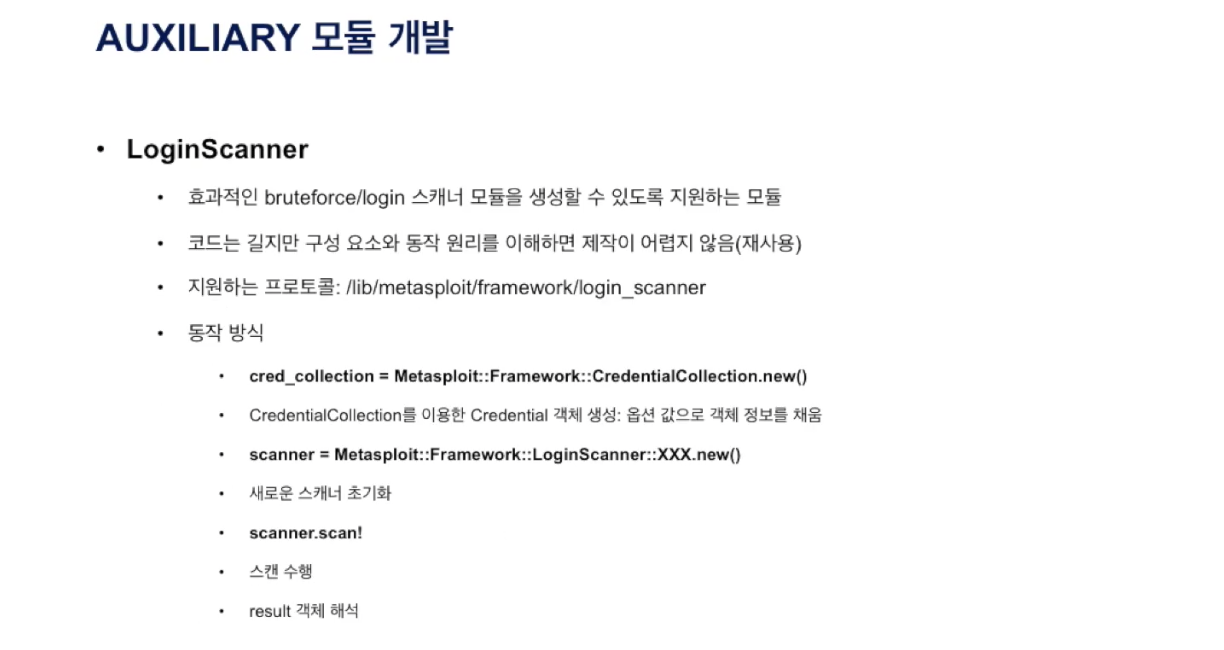 -> Auxiliary 모듈의 경우 기존에 만들어진 코드만 잘 분석해도 충분히 원하는 모듈을 개발할 수 있다. 이것들 중 "LoginScanner"을 이용한 login 스캔의 경우에는 조금 복잡한 구조로 되어 있는데 따로 조금 설명할 예정이다