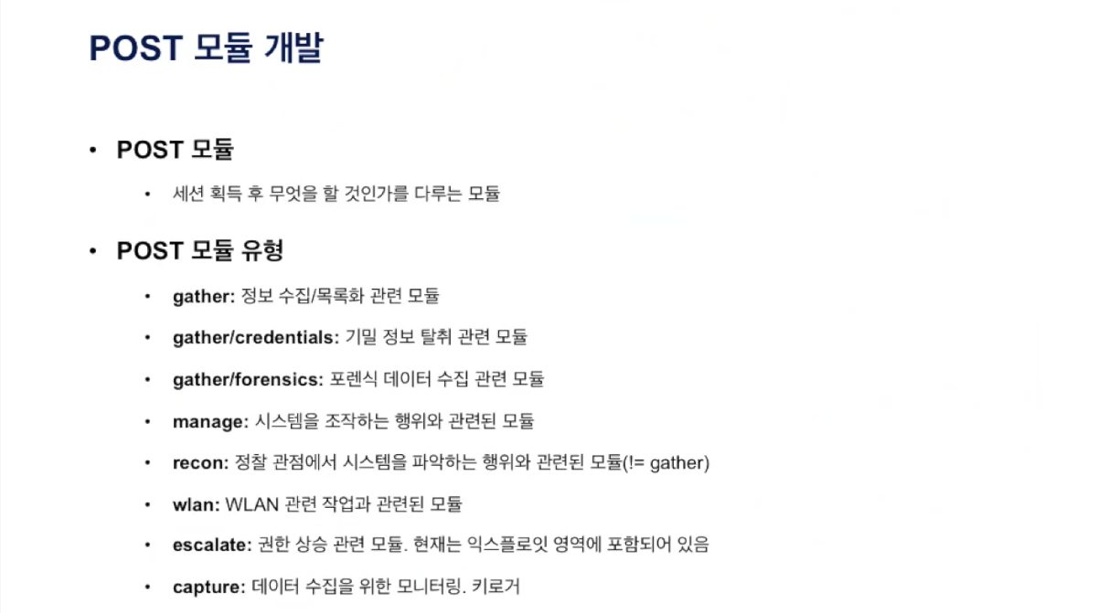 ->> 1단계에서 말하는 "원격" 방식은 통신 기능이 들어가야하며, "로컬"은 세션을 끼고 가는것이다. 여기서 세션을 끼고 간다는 말은 리모트 익스플로잇이 실행을 하고, 리모트 익스플로잇이 성공해서 세션을 획득하고, 실행하는 모듈이다. 사실 포스트 모듈과 약간 비슷하다고 할 수 있다. 왜냐하면 포스트 모듈은 세션을 전제로 하고 있기 때문이다. 하지만 차이점이라고 하면 로컬 익스플로잇은 "권한 상승"에 초점이 맞춰져 있고, 포스트 익스플로잇은 "정보 수집, 지속적인 접근 권한 유지" 등의 기능들을 담고 있다. 그리고 포스트의 경우에는 어떠한 코드를 수행하는것만 있다면 로컬 익스플로잇은 취약점이 있다. 즉, 포스트에는 취약점이 없고, 익스플로잇에는 취약점 코드가 들어가 있다는 차이점도 있다