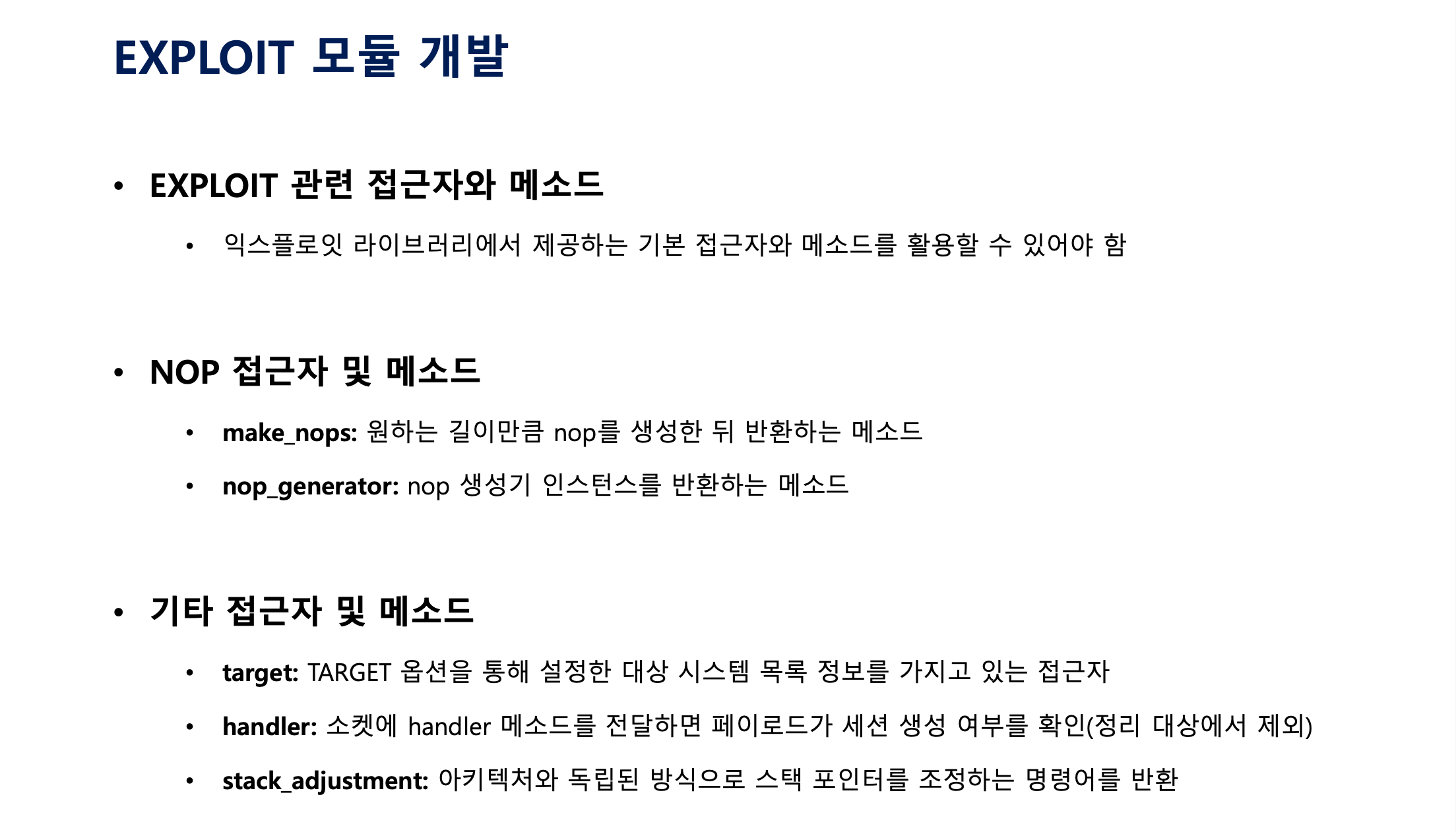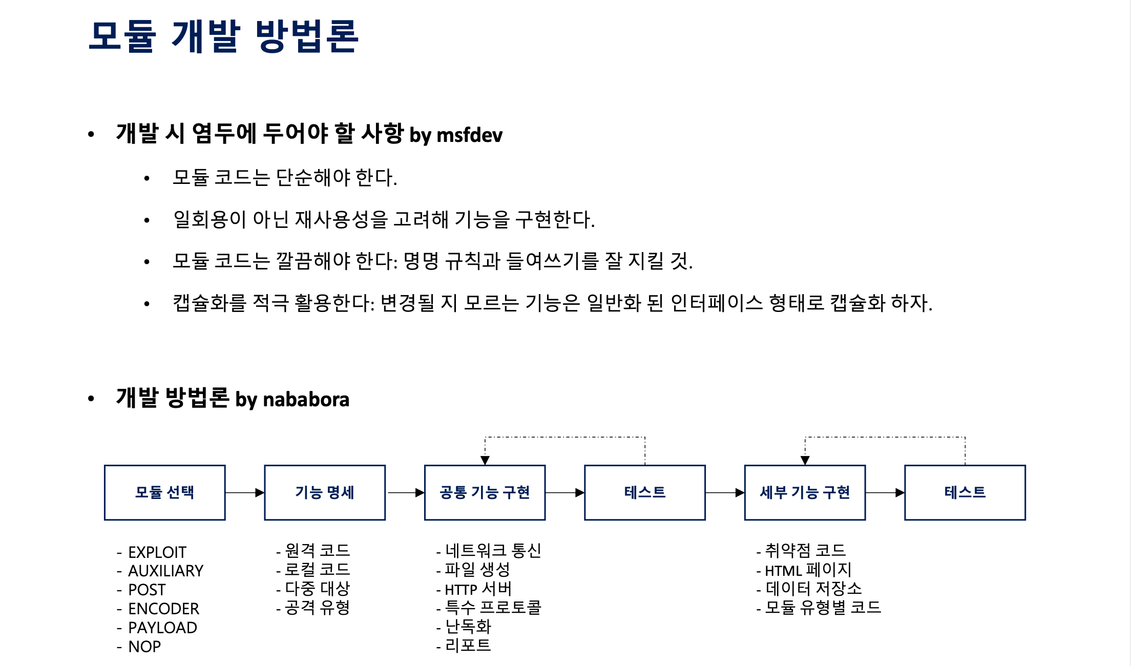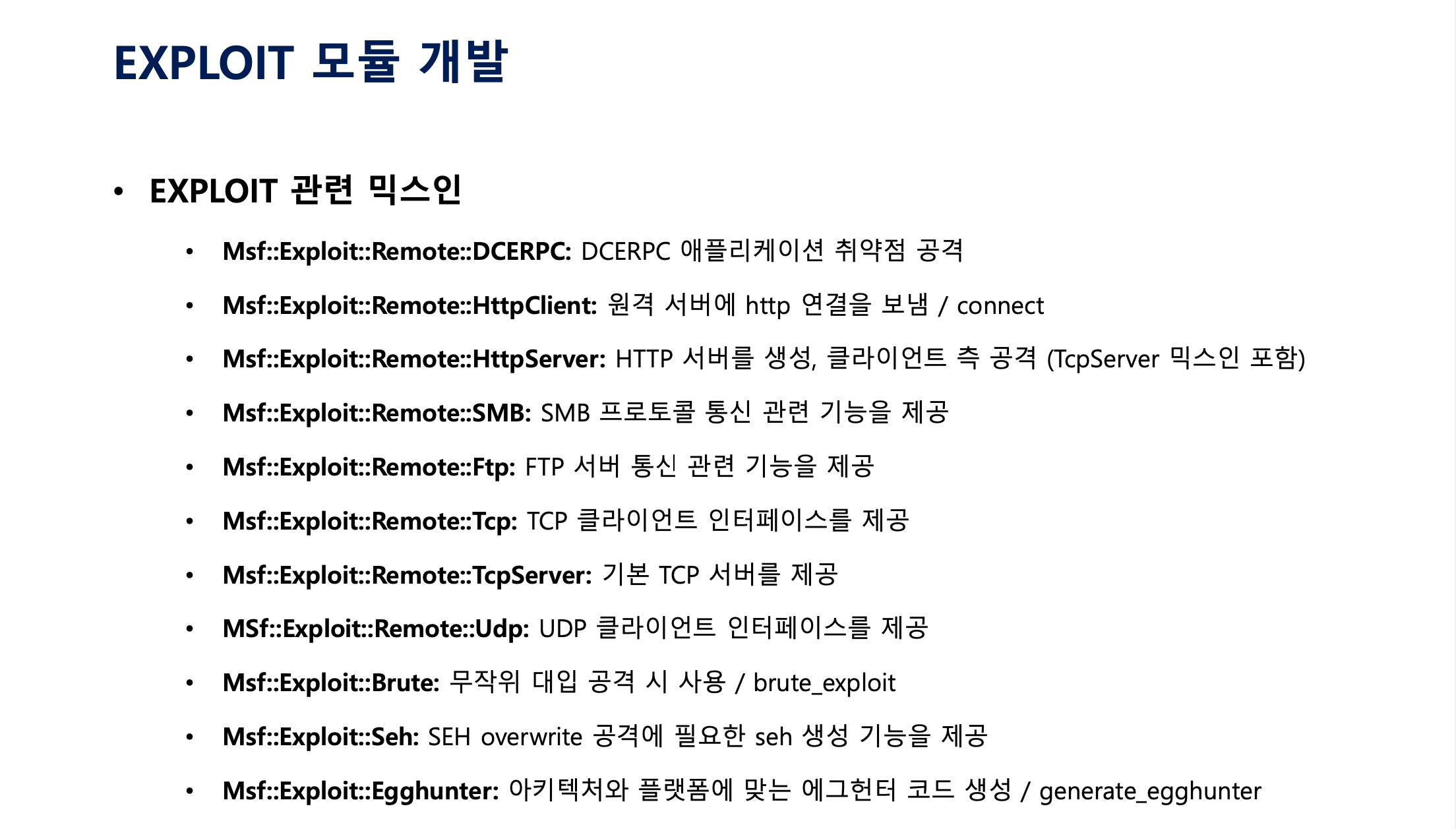 -> exploit 모듈과 auxiliary 모듈, 두 가지에 대해서만 설명을 이어나갈 생각이다. 6가지 정도의 모듈을 개발할 생각이다. 하나의 모듈 단위를 개발하는것이 아니라 각각 6개 중 4개 정도는 기능이 될 것이고, 2개 정도가 실질적인 모듈이 될 것이다. 그리고 모듈 개발 이후에 인터페이스를 하나 만들어 볼 것이다. mini msfconsole이라고 해서 간단한 콘솔 기반의 인터페이스를 만들어 볼 것이다