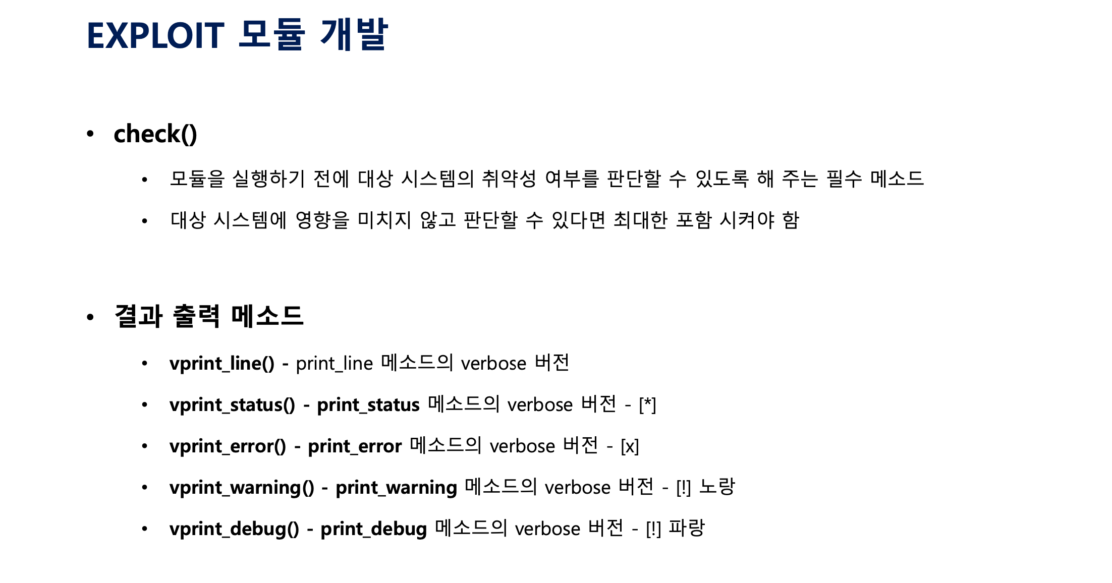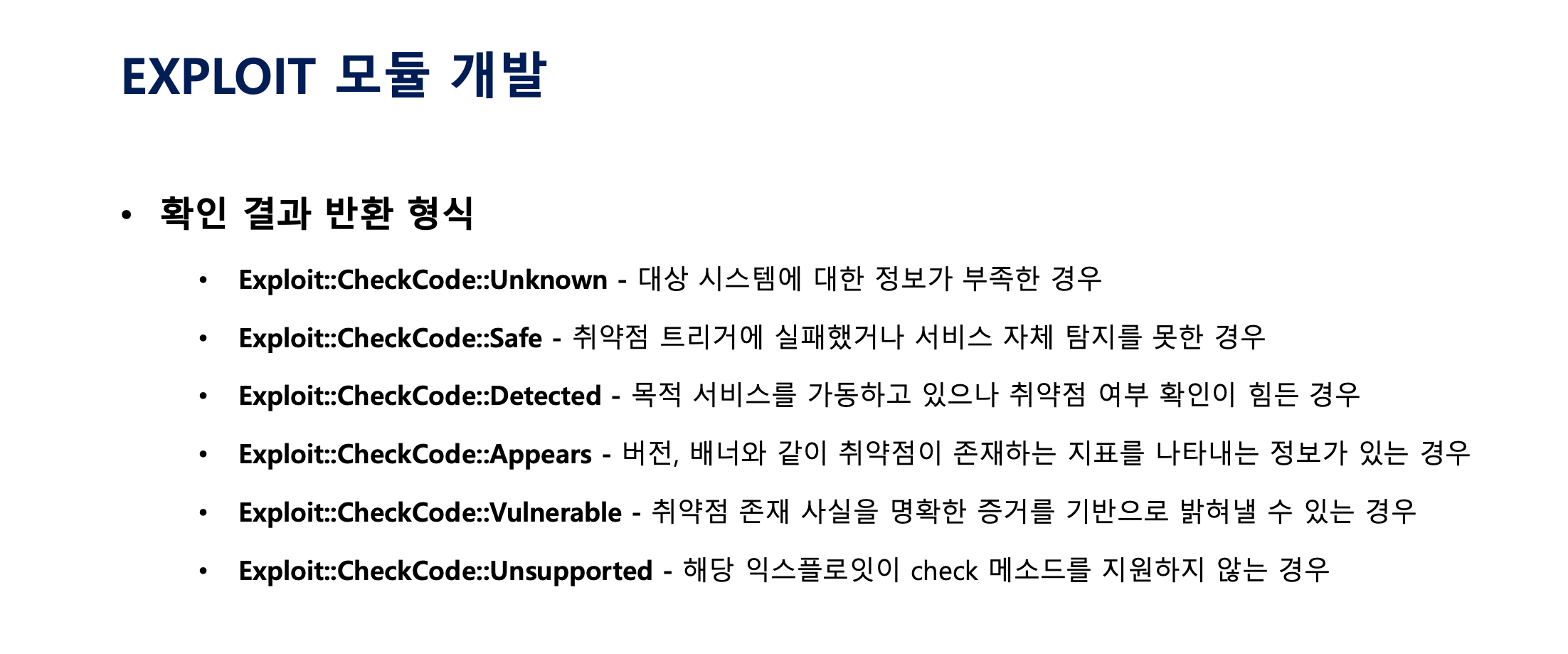-> 다음으로는 "check()" 메소드가 있다. 익스플로잇 코드를 보내지 않고 대상 시스템이 취약한지 아닌지를 확인해 주는 메소드이다. 개발자 사이트에서 구현할 것을 권장하지만, 구현이 불가능한 경우에는 구현하지 않아도 된다
