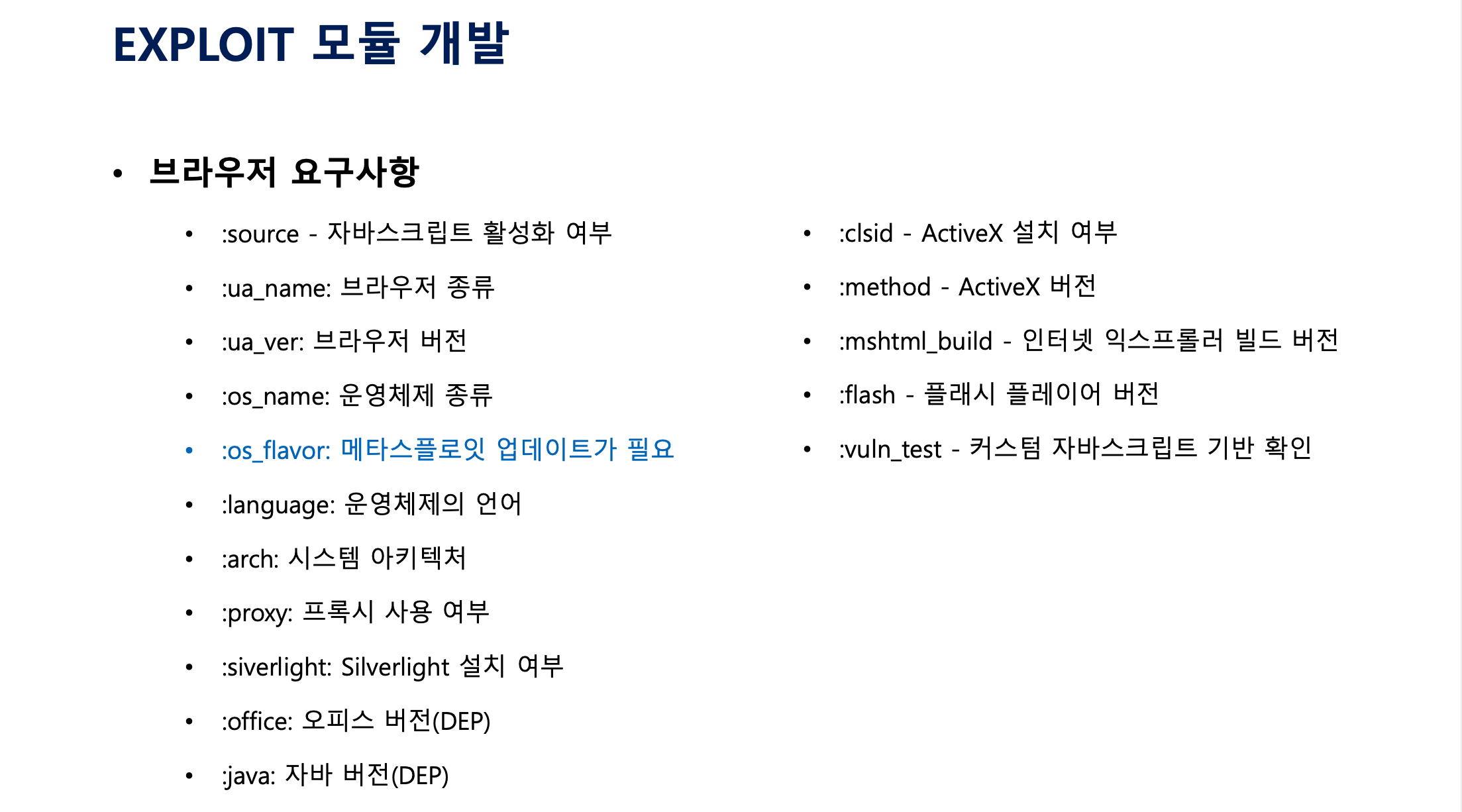 -> 다음으로 브라우저 요구사항이란 것이 있다. 예를 들어, Flash 취약점에서 domain memory, uaf을 보았을 것이다. 클라이언트가 공격자 서버(= 메타스플로잇 서버)에 클라이언트가 접속을 하면 바로 익스플로잇 코드를 보내는 것이 아니라 클라이언트가 익스플로잇이 가능한 조건인지를 확인한다. 운영체제, 플래시 버전, 언어 팩 등을 확인해서 조건에 맞는 경우에만 익스플로잇을 보내주는 방식으로 구성되어 있다