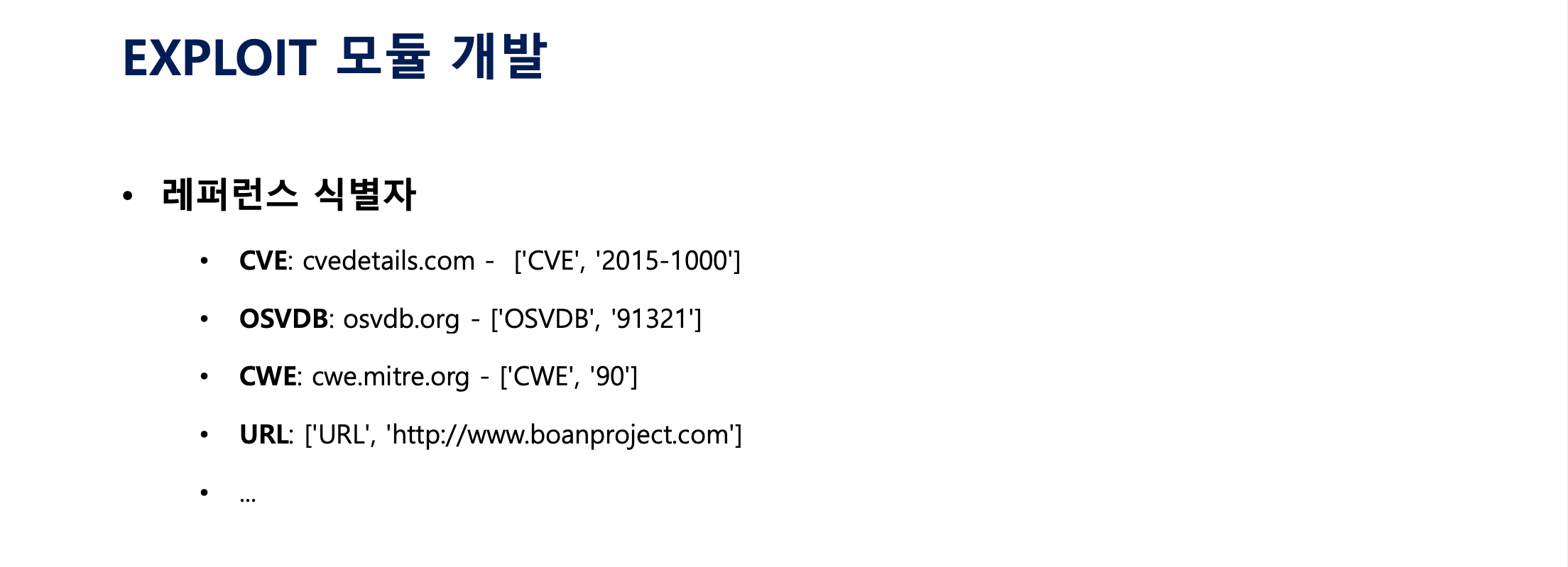 -> 래퍼런스 식별자는 개발할 때 어떤 취약점이 있으면 취약점에 넘버링이 되어 있는 경우가 있다. 취약점 기준에 따라서 취약점 번호가 매겨지는 것이다. 메타스플로잇 코드를 작성할 경우에는 이러한 취약점 넘버 번호를 사이트에 들어가서 검색해보면 실행하고 있는 모델의 정보를 확인할 수 있다
