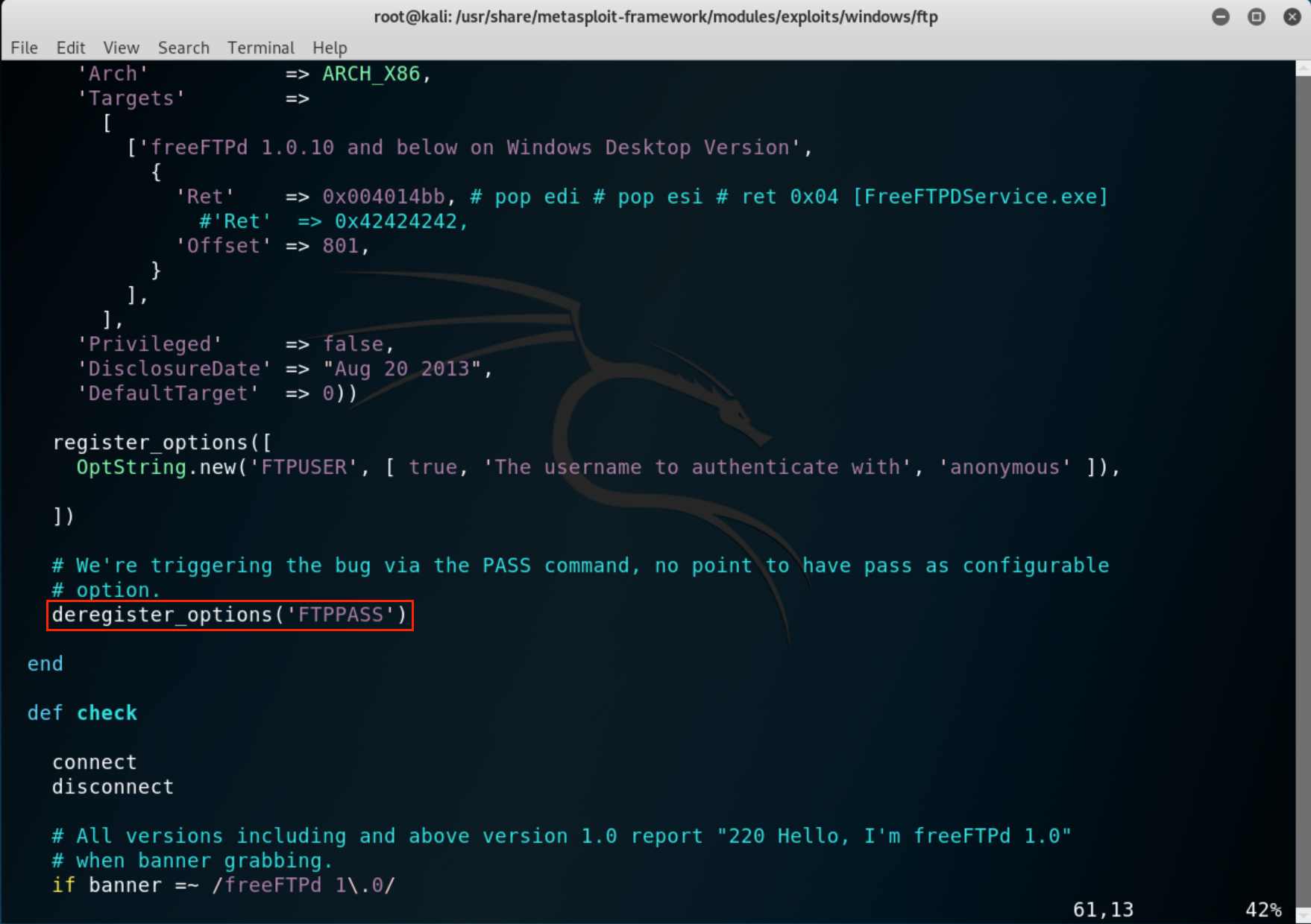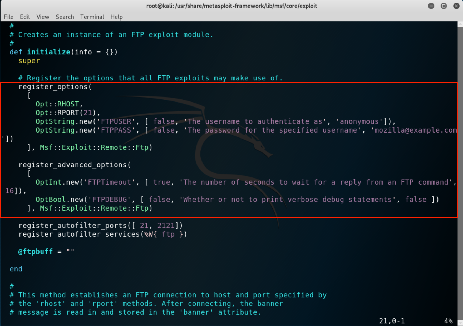 ->>> 확인 결과, 원래는 "register_options"의 "OptString.new"의 옵션이 "false"로 되어 있지만, "freeftpd_pass.rb"에는 "true"로 되어 있는것을 볼 수 있다. 즉, 수정이 가능하다는 것이다.