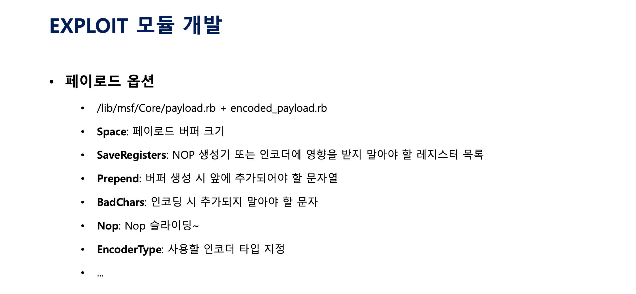 -> 익스플로잇 코드 같은 경우에 옵션 부분에 기본 모듈의 기본 옵션이 있다. Name, Discript 등등의 부분이 있는데 익스플로잇 모듈의 경우에는 페이로드 옵션을 꼭 적어줘야 한다. 타켓도 필요하다. 타켓이라고 하는 것은 주로 "RET", 주로 윈도우7 버전에는 "RET" 주소가 무엇이고, XP 버전에서는 "RET" 주소가 무엇인지를 지정해줘야 한다. 페이로드 옵션은 위의 항목들을 적어주고 페이로드 생성을 하게 되면 그러한 옵션 값을 가지고 페이로드를 생성하는 원리이다