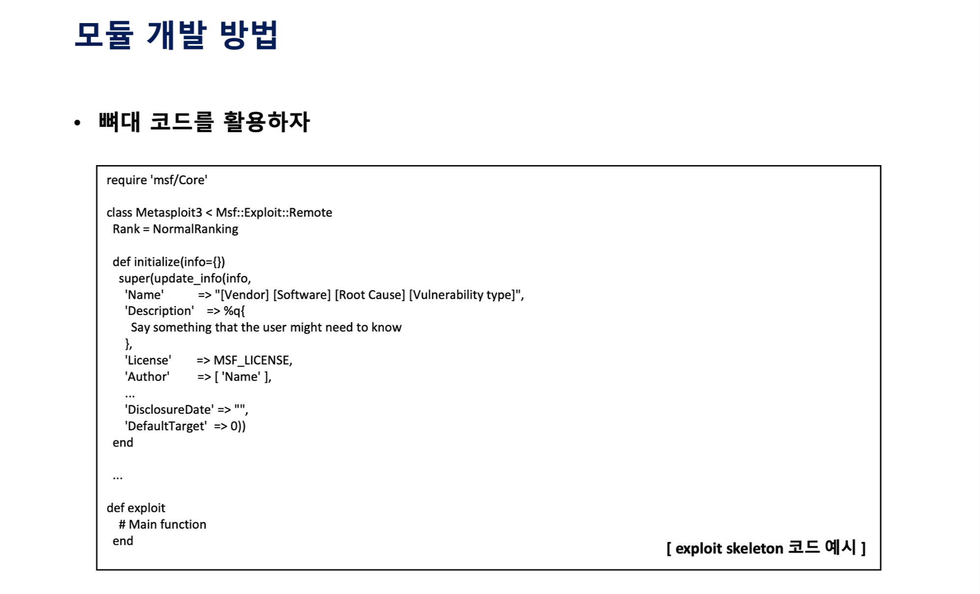 -> 다음으로 "뼈대 코드"인 "스켈레톤"이라고 하기도 하고, "템플릿(= template)"라고 부르기도 하는것을 알아본다. 템플릿 코드를 작성해놓고 거기 안에다가 내용만 추가하면 되는 구조이다. 기본적으로 익스플로잇을 작성할 수 있게 하는 큰 틀인 것이다. 뒤에서 익스플로잇을 개발할 때 쓸텐데 (메타스플로잇 사이트에서 제공한 가이드 코드이다). 기본 틀을 가지고 살을 붙여가면서 개발하면 되는 것이다