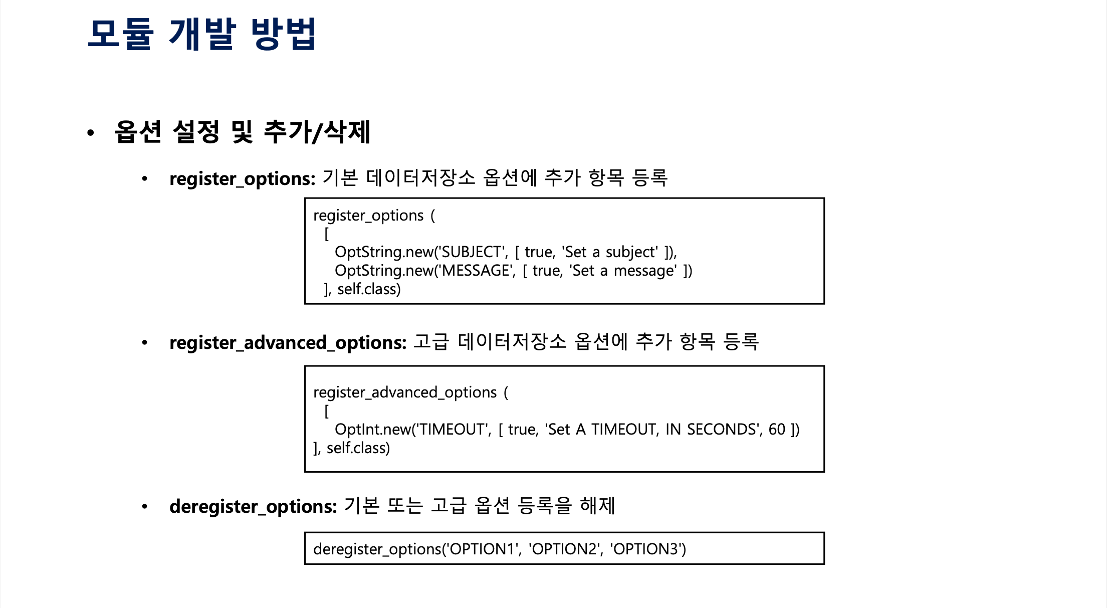 -> 다음으로 추가하고자 하는 옵션 형식에 맞는 이름을 적어주면 된다. 앞에서 봤던 "register_options"에서 봤던 "OptString.new(...."과 같이 그에 맞는 틀이 있다. 추가하고자 하는 옵션 형식에 맞는것을 선택하면 된다. "new"하고 옵션의 이름, "true/false"는 모듈 실행시 반드시 설정해줘야 되는지, 아닌지, "description"은 옵션에 대한 설명, "value"는 옵션의 기본 값이다