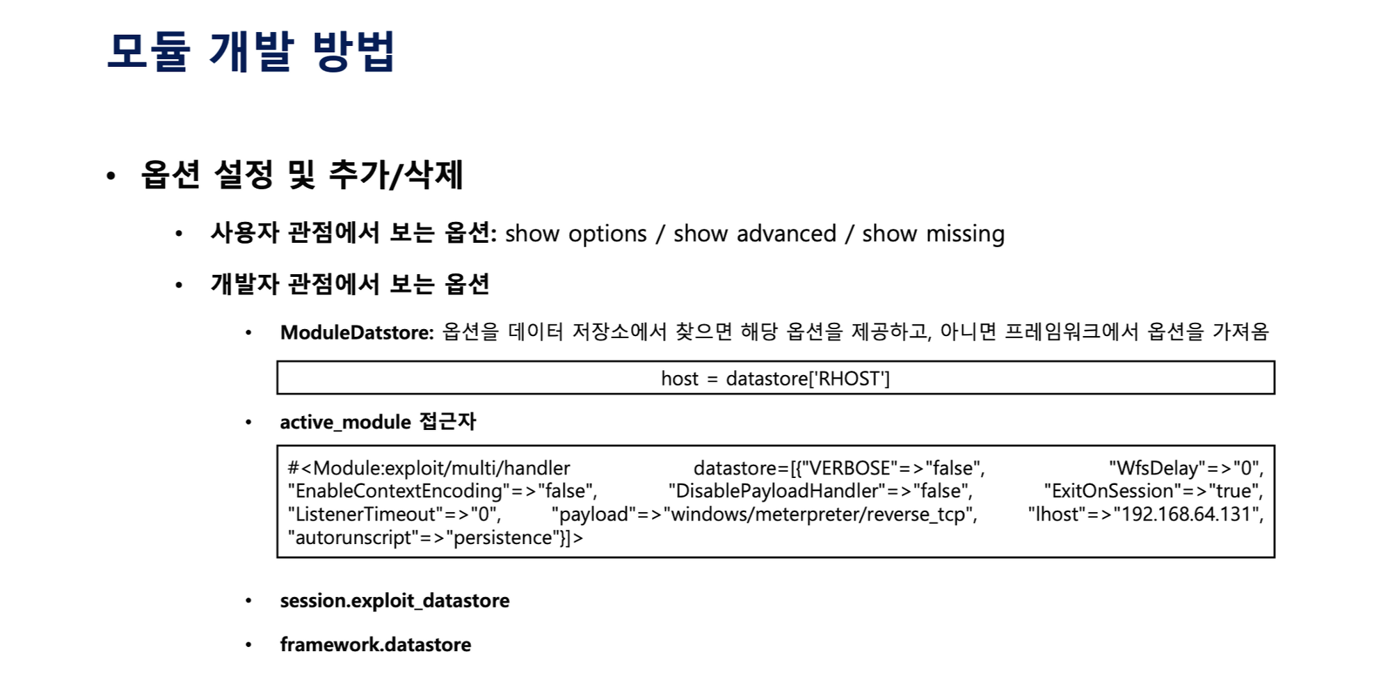 -> 다음으로 개발자 관점에서는 크게 4가지로 볼 수 있다. "ModuleDatastore, active_module 접근자, session.exploit_datastore, framework.datastore"가 있는데 같은 맥락이라고 보면 된다. 접근 방식이 4가지가 있는것 일 뿐이다. 대부분의 경우에서는 "ModuleDatastore" 사용을 권장한다. "irb" 모드에서 혹은 인터페이스 개발하고 있을때 익스플로잇이 있다고 한다면 exploit.datastore에 rhost라고 명령하면 현재 설정한 rhost(= remote host) 값을 확인하거나 수정할 수 있다. "active_module 접근자"의 경우에는 irb 모드에서 "active_module" 이라고 치면 나타난다. "session.exploit_datastore"는 세션을 획득 했을때, 그리고 "framework.datastore" 프레임워크를 이용해서 여러 가지 실행시켜 놓은 뒤, irb 모드로 들어가서 확인하면 현재 데이터 스토어에 등록된 것을 확인할 수 있다